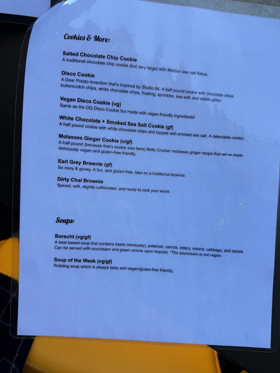 Dear Potato Bakery offers a delightful selection of baked goods and comforting dishes that cater to a wide range of tastes. For those with a sweet tooth, the Salted Chocolate Chip Cookie and Disco Cookie (along with its vegan version) are standouts, with the White Chocolate + Smoked Sea Salt Cookie and Molasses Ginger Cookie offering a variety of flavors. If you're craving something heartier, the bakery's Borscht and rotating Soup of the Week offer warm, satisfying options. Dessert lovers will be drawn to their impressive cake selection, featuring classics like Carrot Cake, Chocolate Cake, and Vanilla & Pistachio Cake, alongside indulgent choices like the Devil's Chocolate Cake and creamy New York Cheesecake. For a more savory experience, the bakery excels with offerings such as the Ube Pecan Sticky Bun, Pumpkin Cardamom + Cinnamon Roll, and the savory Rosemary + Nutritional Yeast Bear Bun. The Garlicky Cheddar Biscuit and Daily Vegan Donut round out the menu, ensuring a treat for every preference. Whether you're stopping in for a quick snack or a full meal, Dear Potato Bakery delivers an impressive variety of freshly made, mouth-watering options.